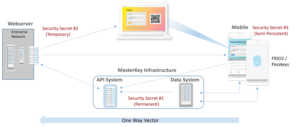 The system functions as a one-way trust vector. Only the original webserver can decipher the encoded credentials, and only if the process is first initiated by the user’s mobile. Two-factor authentication is achieved in a single step by passing through the unique device signature of the user’s phone. Proof-of-presence (biometric scan) using Passkeys/FIDO2 can optionally provide a third factor of authentication.